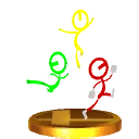Mites are small, yellow, red, or green stick-figure creatures with heads resembling the Subspace Army logo. They resemble Mr. Game & Watch in terms of movement and stance. They use melee attacks, which inflict minor damage (3-5%) and appear to have fixed or very little knockback. Mites usually attack with an aerial attack resembling a Sex Kick. Mites are sometimes spawned en masse from Generators indefinitely, until the player's fighter destroys the Generator. Mites can be defeated on their own easily, usually from only a single hit, but are dangerous in high numbers. Down attacks are the most effective way to defeat Mites.