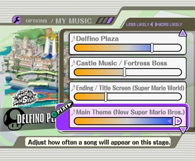 - In the image at the top of this page (which is also on the DOJO!!), the "Castle Music/Fortress Boss" song is present on the Delfino Plaza stage. This indicates that the developers originally intended for the song to be on this stage, but they instead moved it to the Luigi's Mansion stage.