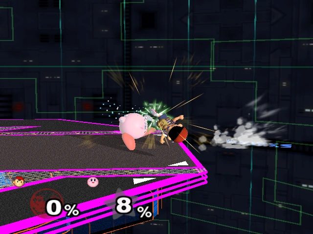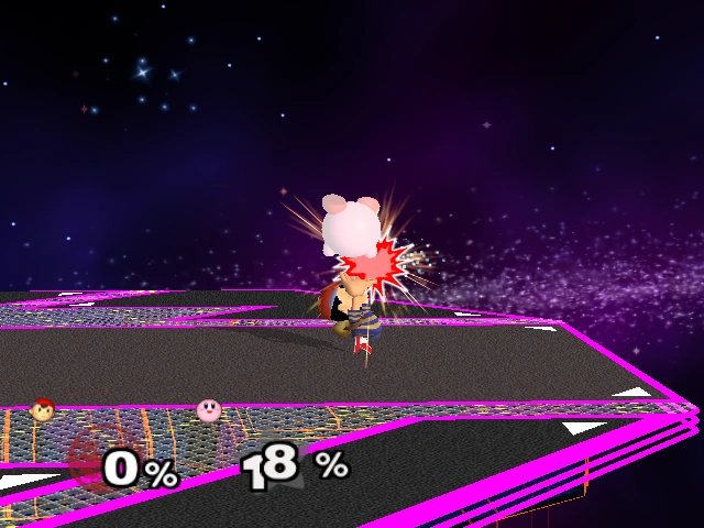 PK Drop Kick | 16% (clean), 10% (late) | Ness performs a reverse dropkick. When hit at the beginning to the attack, it electrocutes the foe and launchess them at a semi-spike trajectory. The fourth most powerful back aerial in Melee. | |
