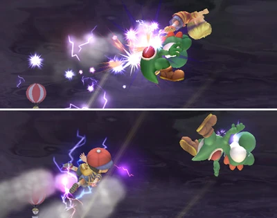 On the other hand, Ness' is more useful for techniques like juggling, since after his Thunder hits an enemy, he can use it again repeatedly. Also, as it pulls opponents towards him, it can keep opponents with a good aerial game from staying in the air too long. After both characters pull this move in the air, they are sent in a helpless fall animation.