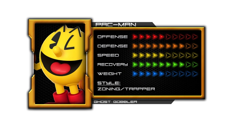 Pac-Man is a Trapper with decent tools that help with Zoning. He is a character that specializes in using unpredictable projectiles to rack up damage and setup for KO's. He has camping potential using his Down Special and Nuetral Special, a decent, fast poking tool with his Side Tilt and Forward Aerial, a good combo starter using Up Tilt, Dash Attack or Down Tilt, which can be followed up by an Up Aerial or Forward Aerial, reasonably strong smashes, and a far-reaching recovery Up Special. His Down Special is safe on shield, can punish jugglers, and can be launched into opponents as a late KO move. His Nuetral Special is very versatile and can be used as a combo starter, a follow-up, an edgeguarding tool, and sometimes a late KO move as well. His Side Special covers a lot of area and can be used as a horizontal or vertical recovery move. His grab also has utility, in his Back Throw, which can kill at a somewhat late percentage, and his Down Throw, which can be followed up by a Dash Attack.