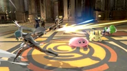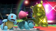 - Left: Backflips, spins, and faces the screen with a happy expression. This resembles its "character chosen" animation in Super Smash Bros.