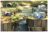 Garden of Hope: Set in the second area in Pikmin 3 in Super Smash Bros. for Wii U only. The layout of the stage is mostly the same, aside from the waterfall. It consists of two large platforms, a Climbing Stick, a pot, and a set of Elevator Platforms on the side, which function as scales. A small bridge appears to connect the two large platforms. Fighters can destroy the pot and the Climbing Stick, and can stand on top of both. Wild Pikmin will come onto the stage to fix any damage done, such as rebuilding the bridge and the pot. Fighters can get stuck in the pot if they stand in the middle while Pikmin are rebuilding it. The Peckish Aristocrab is a major stage hazard here, and a Bulborb will appear in the background.