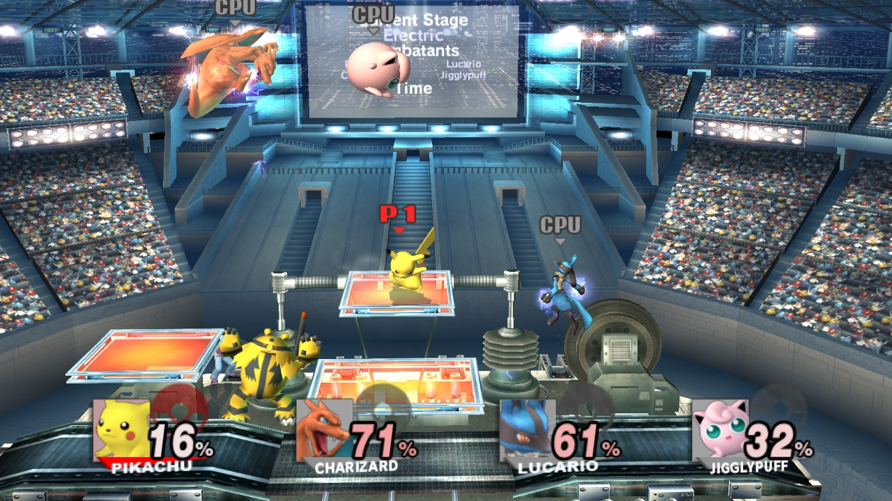 | Characters | Pikachu / Pikachu Libre (64 · Melee · Brawl · 3DS/Wii U · Ultimate) Jigglypuff (64 · Melee · Brawl · 3DS/Wii U · Ultimate) Pichu (Melee · Ultimate) Mewtwo (Melee · 3DS/Wii U · Ultimate) Pokémon Trainer (Brawl · Ultimate): Charizard (Brawl · 3DS/Wii U · Ultimate) · Squirtle (Brawl · Ultimate) · Ivysaur (Brawl · Ultimate) Lucario (Brawl · 3DS/Wii U · Ultimate) Greninja (3DS/Wii U · Ultimate) Incineroar (Ultimate) | |