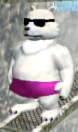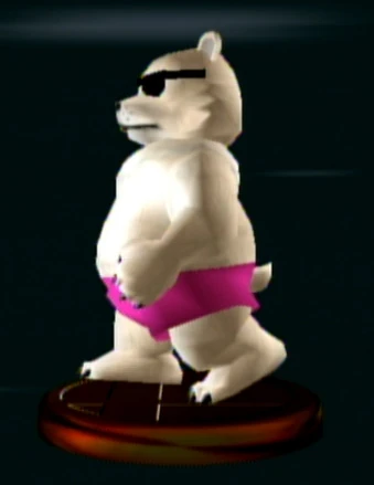 Polar Bears are tall, bipedal, arctic bears that wear shorts and a pair of sunglasses. It is unknown why they wear pink shorts and sunglasses, and the Polar Bear trophy does not clarify this. Polar Bears originally made an appearance in the Ice Climber game for the Nintendo Entertainment System. Polar Bears would appear as an enemy on the mountain that the Ice Climbers were scaling. The Polar Bears were frustrating to the Ice Climbers and were hard to destroy.