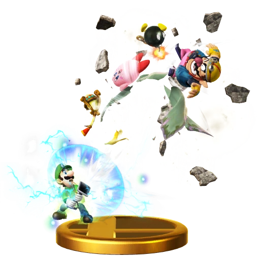 Luigi's Poltergust appears on his back and begins vacuuming in different directions around him. Luigi can guide which direction the suction is facing, but cannot move. After a certain amount of time or when all opponents are caught in the vacuum, the suction will stop and anyone caught in the vacuum will be ejected, flying far away.