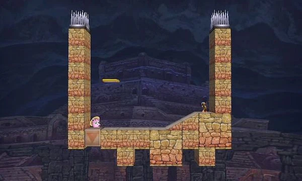 This stage features ledges that characters cannot grab, thus recovery becomes more difficult. Characters should fight to remain on the stage. There is a small moving platform below the right tower, positioned to move between the left and right side. A character, with luck to find the platform at the same side, may use it to recover.