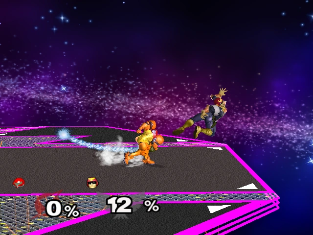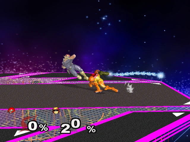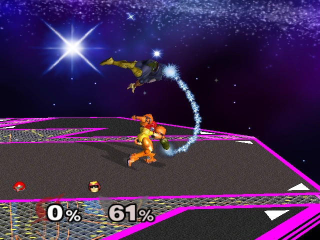 Samus has many advanced techniques including a fast and fairly long wavedash, Super Wavedash, Crouch cancel counter, and the ability to extend her already long grapple. Samus has the least average landing lag from her L-canceled aerials - all are 7 frames. On the downside, Samus has the slowest roll in the game. She also has a hard time comboing most characters. In the case of the Star Fox characters, it is hard to initiate the combos because the guaranteed ones require a grab.