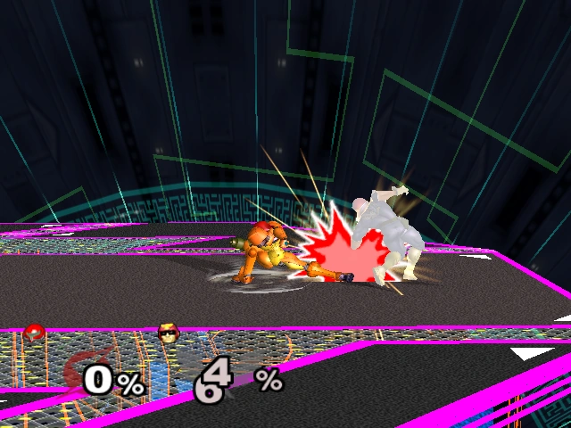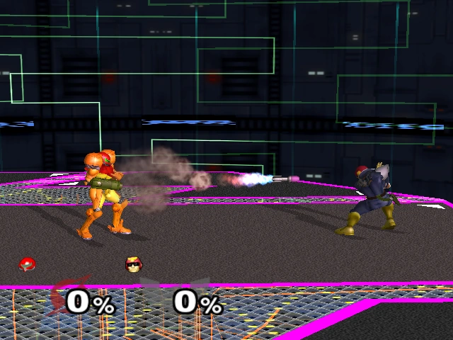 Samus (サムス, Samus) is a starter character in Super Smash Bros. Melee. Returning as a veteran from the previous game, Samus, similarly to Link, reprises her role as a short-ranged fighter with numerous ranged options. In addition, she received some powerful buffs, causing her to improve from a bottom-tiered character in Super Smash Bros. to a high-mid tiered character in Melee.