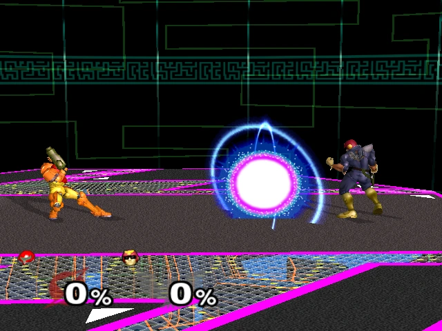 Charge Shot | 3-25% | When the B button is pressed, Samus will start charging a ball of energy that gets larger, stronger, and faster with more charge. Pressing the B button again during the charge will fire the shot, while pressing the L or R button will cancel the charge and allow Samus to store her current charge. When used in the air, Samus will fire the shot, regardless of its charge level. | |
