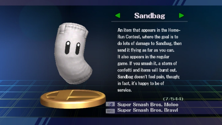 In Melee and Brawl, the Sandbag trophy is obtained by completing the Home-Run Contest with every character. Note that characters who may be switched during matches, namely Zelda and Sheik, Samus and Zero Suit Samus, and the Pokémon Trainer's Pokémon, need not all be used; one each is sufficient. However, the Sandbag trophy does not have unlocking criteria in 3DS/Wii U, and can be earned randomly.