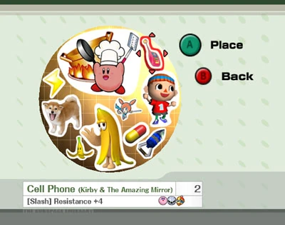 In The Subspace Emissary, you can place stickers on trophy stands to augment the offensive and defensive abilities of your characters. But stickers must be applied neatly-- they must be fully on the stand and must not overlap. Sticker power generally corresponds to sticker size--bigger is better. But big stickers take up more room, so you must strike a balance.