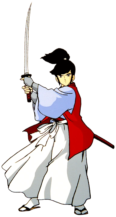 The main character of The Mysterious Murasame Castle. In this game, he dashes and jumps straight to the nearest opponent and shows off his swift sword skills. If he's got a bit of distance, he uses his special ninja techniques, based on the rook and the bishop in Japanese chess, to send projectiles spinning through the air.