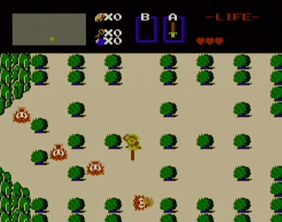 The Bubble, Darknut, Octorok, Peahat and Stalfos enemies first appeared in this game. Bubbles are invincible, but they do not cause damage. A touch from them causes Link to be unable to use his Sword for a short time. Darknuts come in red and blue types, with blue being the stronger of the two. They move slowly and are only a dangerfor Link when he comes in direct contact with them. Only attacking them from behind or the side will hurt them, and touching them causes Link a lot of damage. Octoroks come in red and blue types as well, and the blue ones are stronger. They attack by spitting rocks. Peahats are the spirits of dead flowers, fluttering around the screen in packs. They flutter about the screen and can only be harmed when they stop moving. Stalfos are skeletons that block attacks with their shields. However, when their attention is focused in front, they're very vulnerable to attacks from behind.