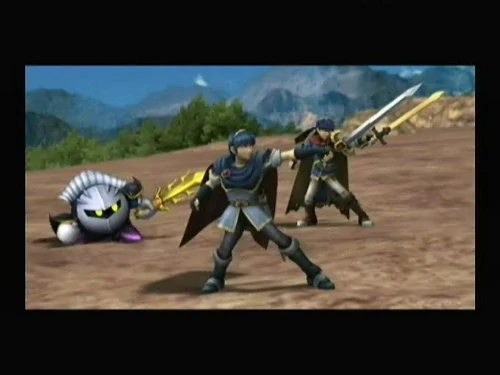 Marth, Ike, and Meta Knight are atop a cliff watching a large tank-like creature, Galleom, drive through the desert. Ike quickly jumps off the cliff to investigate the metal creature. Marth and Meta Knight glance at each other briefly, then Meta Knight follows after Ike. After a little pause, Marth soon follows.