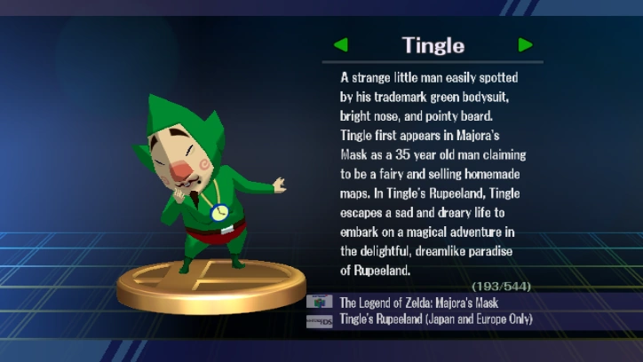 Tingle appears in this game as one of the many trophies that can be randomly collected by typical means, namely through the Trophy Lottery and the various single player Regular Matches. This is what it reads: