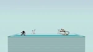The stage takes place in the studio of Wii Fit. You fight on a blue carpet with a few Wii Balance Board floating in the sky acting as the platforms. The platforms are known to change from places, and sometimes also completely disappear. On the stage three objects can be seen, the talking Wii Balance Board, a cycling machine and a treadmill. The background is a giant mirror which shows the mirror images of the characters on stage. Sometimes a coloured silhouette of the Wii Fit Trainer appears and performs some moves.
